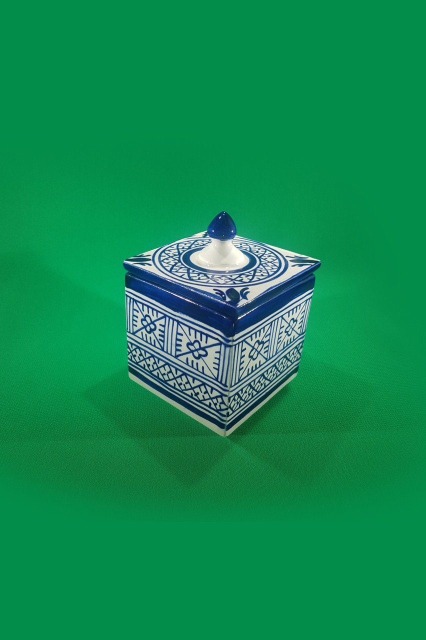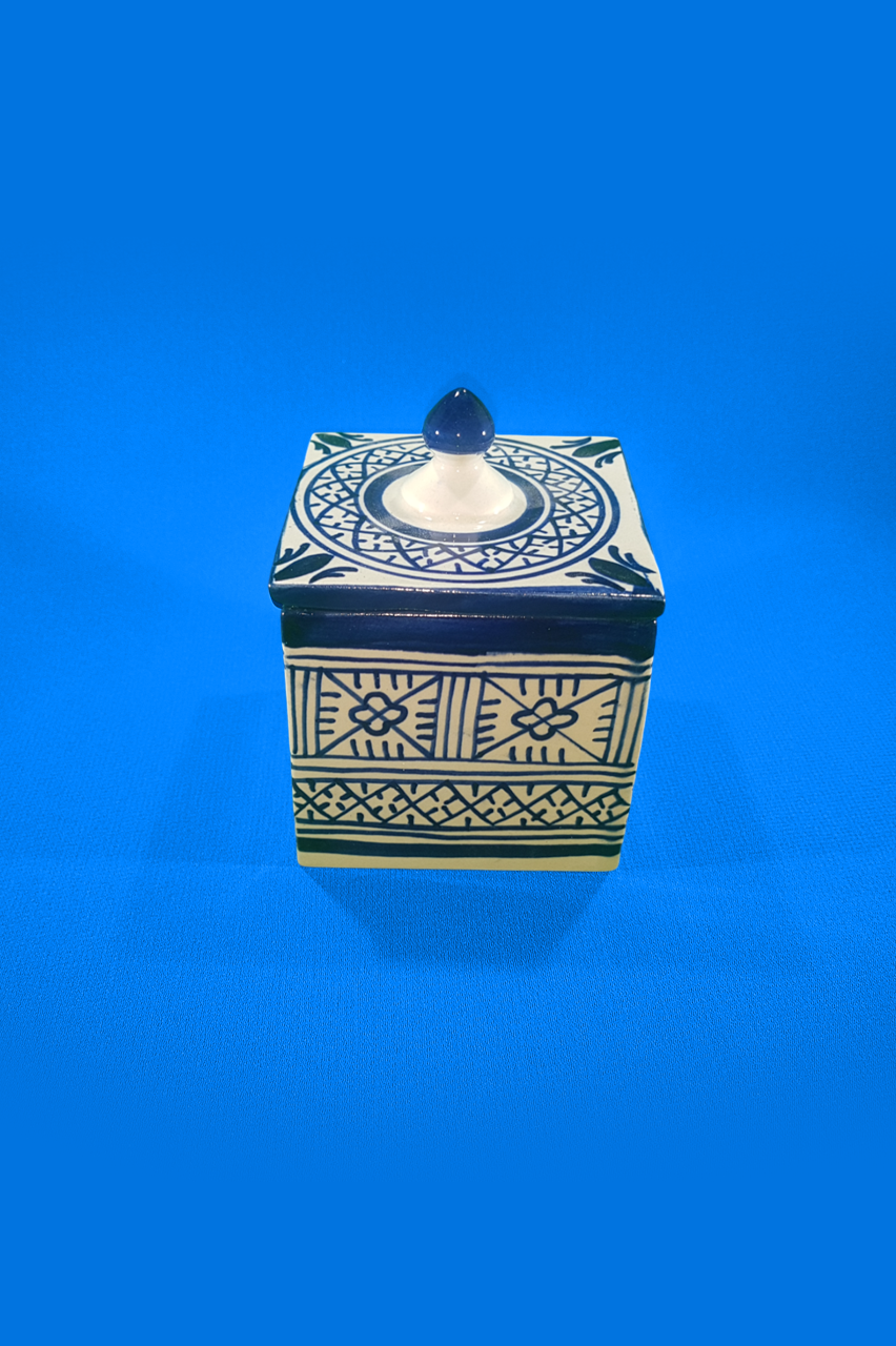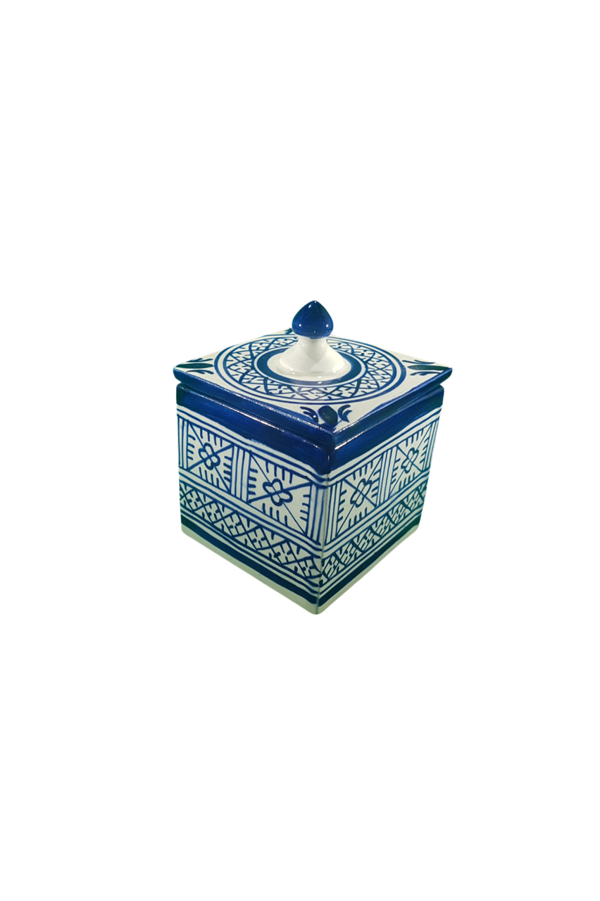 This exquisite Moroccan ceramic sugar bowl is a beautiful and functional piece for any kitchen. Handcrafted by skilled artisans in Fes, Morocco, the bowl showcases intricate blue and white geometric patterns, a hallmark of traditional Moroccan pottery. The bowl is topped with a domed lid and has a square base. It is perfect for storing sugar, spices, or other small items.
