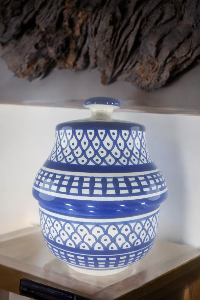 This exquisite handcrafted ceramic storage jar showcases traditional Moroccan artistry with a bold and elegant blue mosaic design. Made from high-quality clay and glazed for durability, it features intricate geometric and floral patterns inspired by North African tile work. The jar is ideal for storing spices, small trinkets, or even as a decorative piece to add a touch of sophistication and cultural flair to your kitchen, bathroom, or living space.