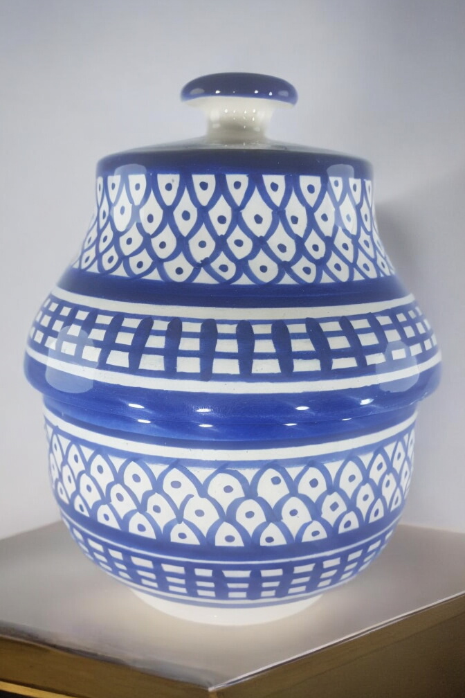 - Design: Traditional Moroccan pattern with radial symmetry on the lid and geometric bands on the sides.