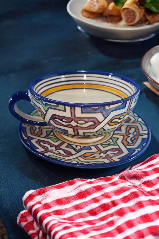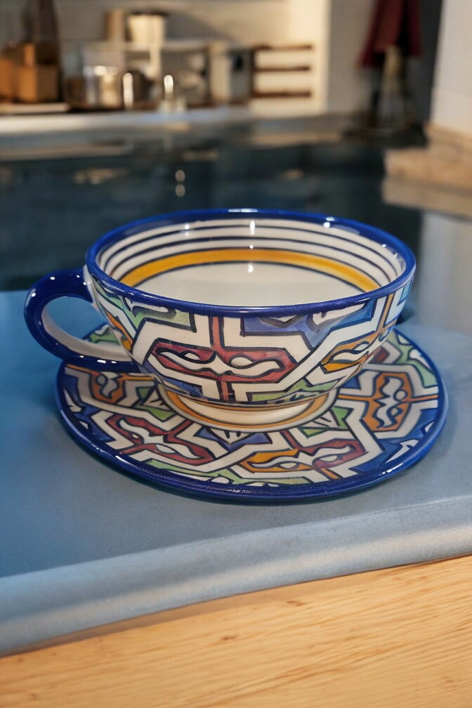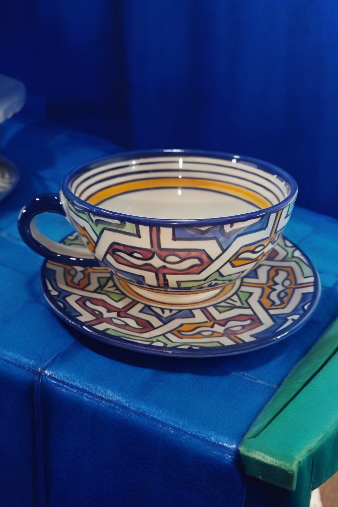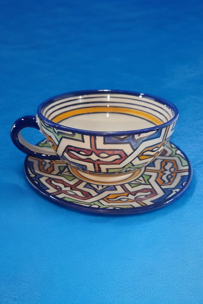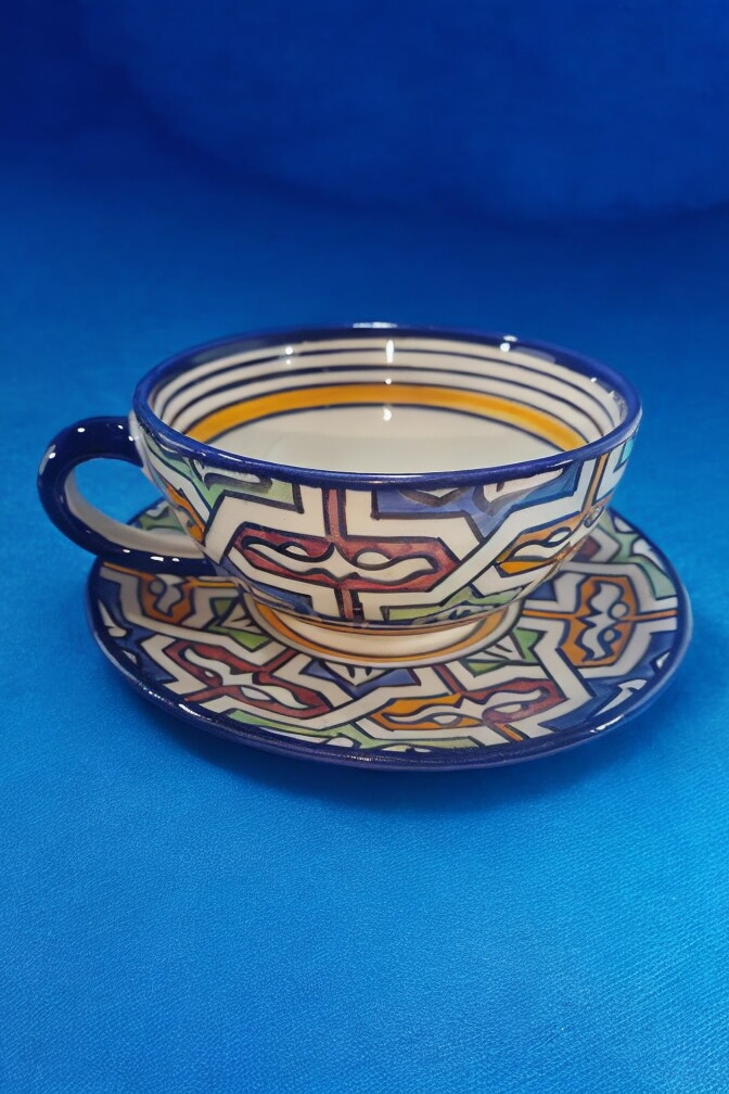 This exquisite Moroccan ceramic cup and saucer set is a beautiful and functional piece for any home. Handcrafted by skilled artisans in Fes, Morocco, the set features intricate geometric patterns in vibrant shades of blue, red, yellow, green, and orange. The cup and saucer are perfect for enjoying your favorite beverage or displaying as decorative pieces.