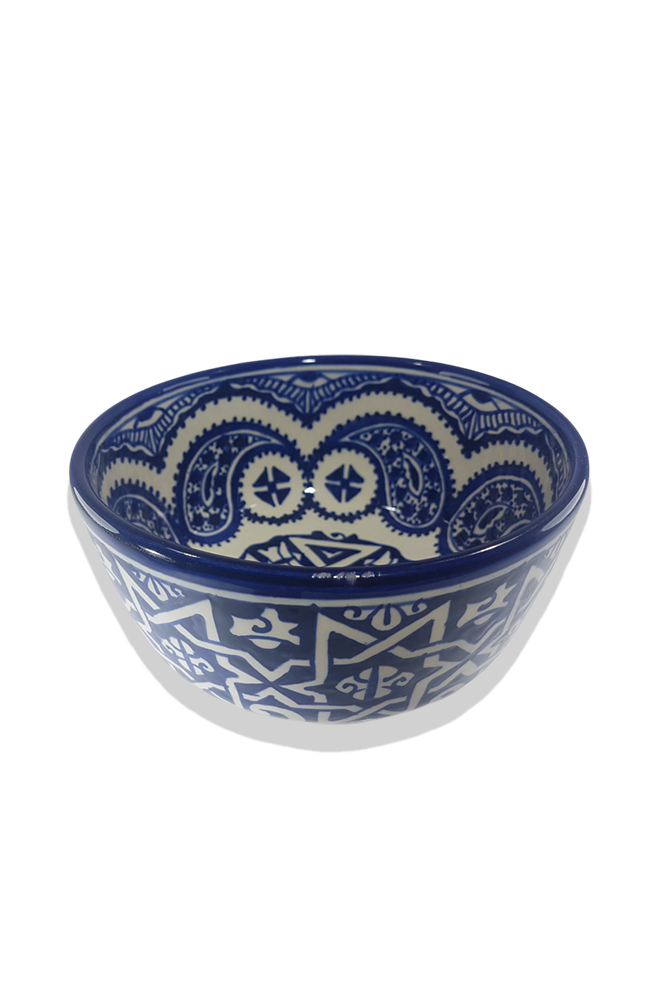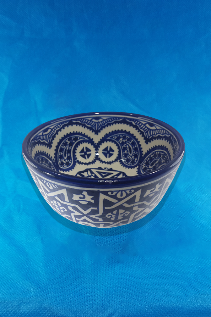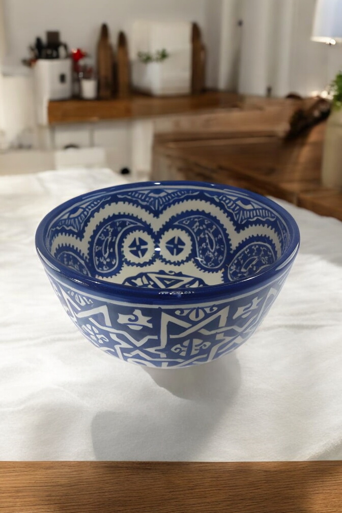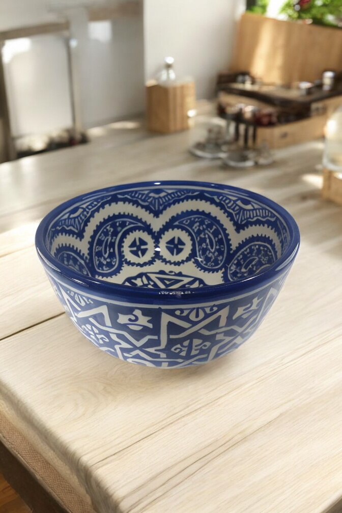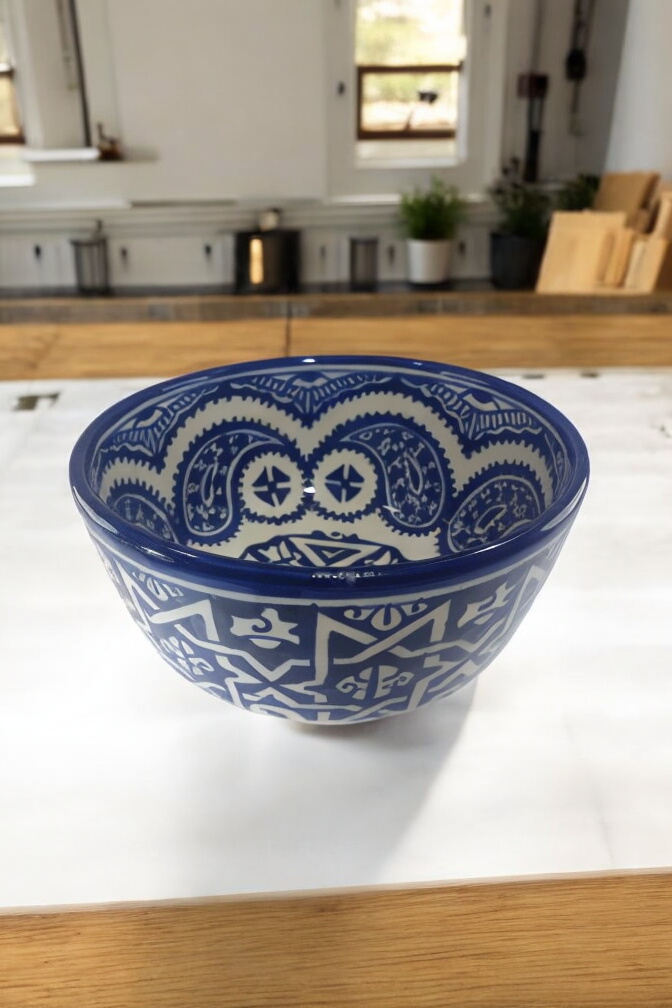 This exquisite Moroccan ceramic salad bowl is a beautiful and functional piece for any table setting. Handcrafted by skilled artisans in Fes, Morocco, the bowl features intricate blue and white geometric patterns that are characteristic of traditional Moroccan pottery. The bowl is perfect for serving salads, soups, or as a decorative piece.