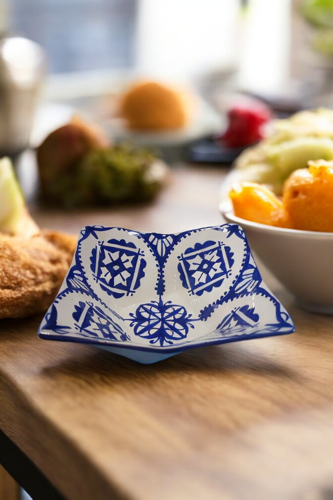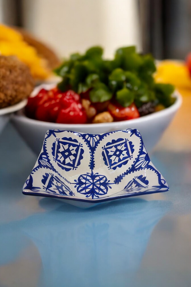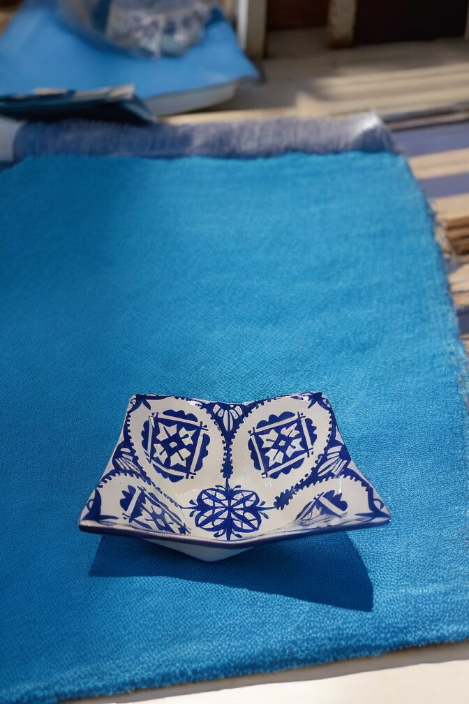 This exquisite Moroccan ceramic square snack plate is a beautiful and functional piece for any table setting. Handcrafted by skilled artisans in Fes, Morocco, the plate features intricate blue and white geometric patterns that are characteristic of traditional Moroccan pottery. The plate is perfect for serving snacks, appetizers, or as a decorative piece.
