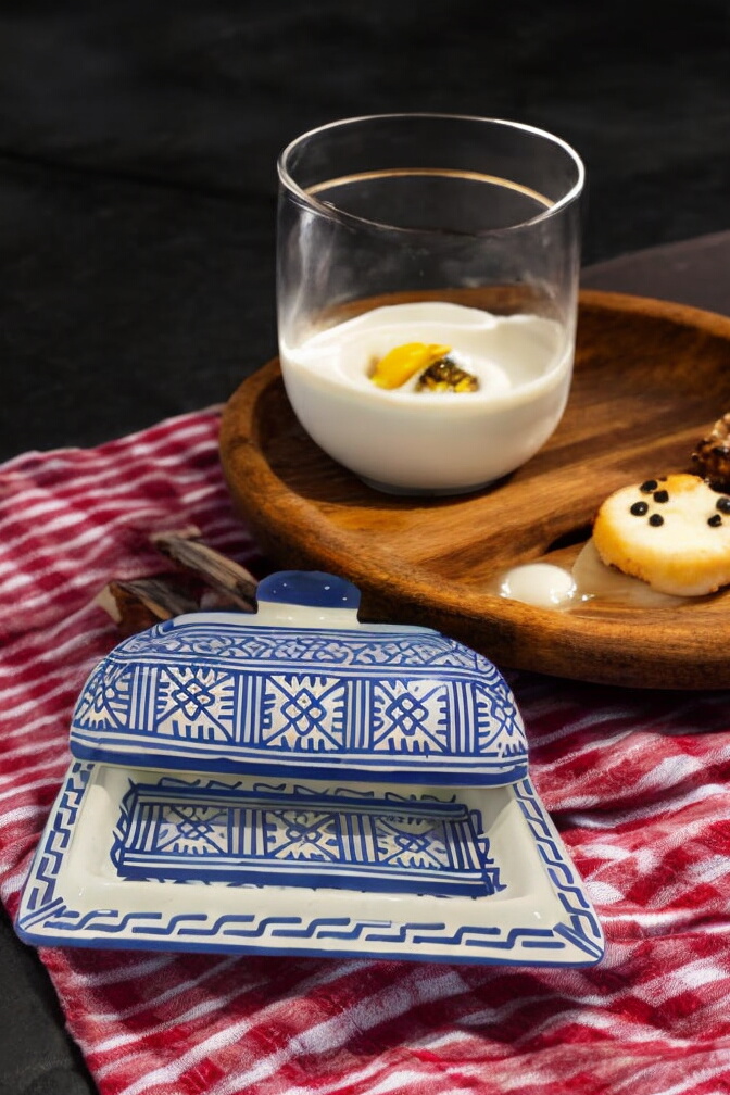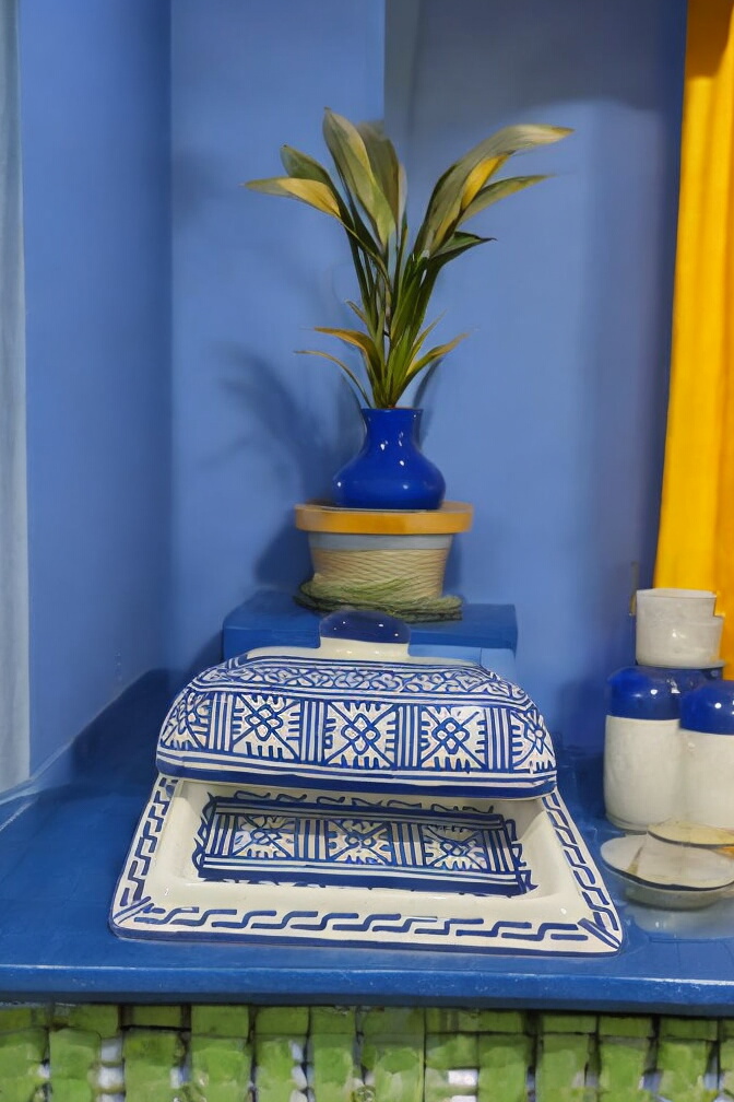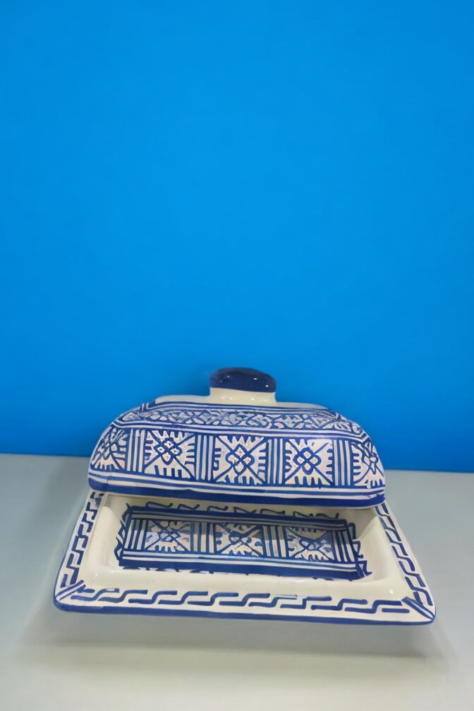 This exquisite Moroccan ceramic butter dish is a beautiful and functional piece for any kitchen table. Handcrafted by skilled artisans in Fes, Morocco, the dish features intricate blue and white geometric patterns that are characteristic of traditional Moroccan pottery. The dish is perfect for storing and serving butter or as a decorative piece.