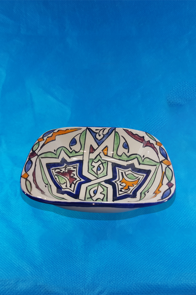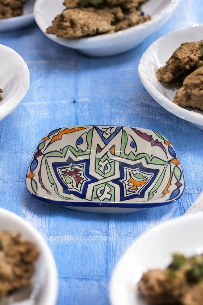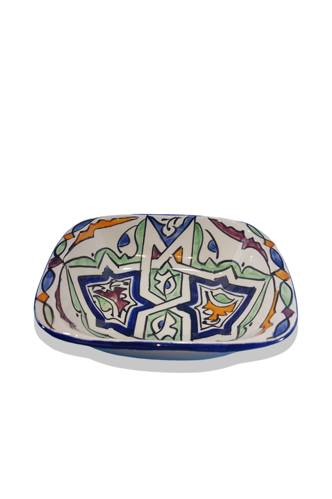 This exquisite Moroccan ceramic square snack bowl is a beautiful and functional piece for any table setting. Handcrafted by skilled artisans in Fes, Morocco, the bowl features intricate geometric patterns in vibrant shades of blue, yellow, green, and orange. The bowl is perfect for serving snacks, appetizers, or as a decorative piece.