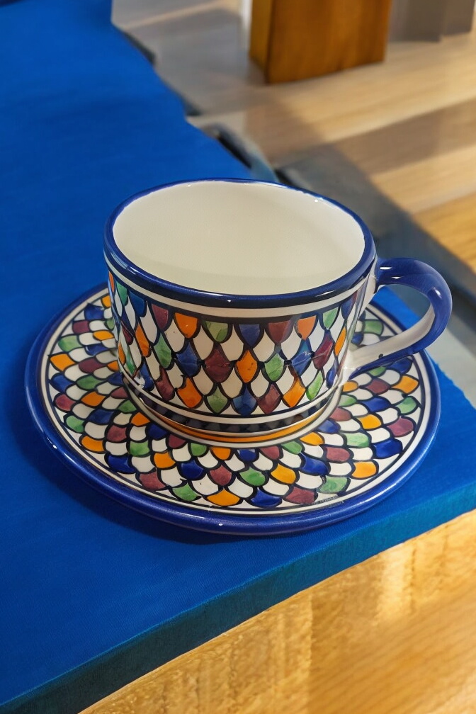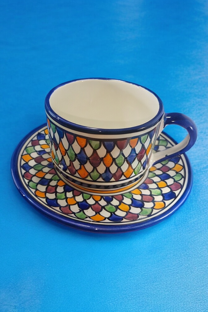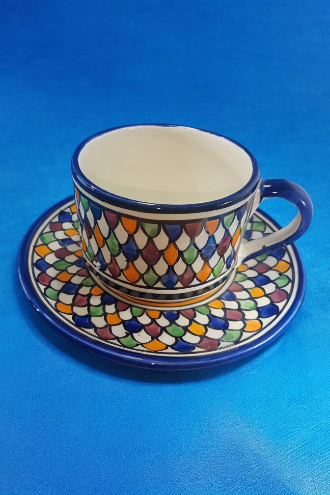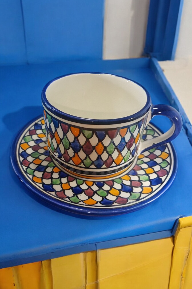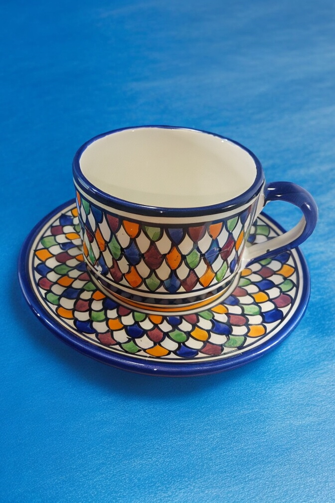 This exquisite Moroccan ceramic cup and saucer set is a beautiful and functional piece for any home. Handcrafted by skilled artisans in Fes, Morocco, the set features intricate geometric patterns in vibrant shades of blue, red, yellow, green, and orange. The cup and saucer are perfect for enjoying your favorite beverage or displaying as decorative pieces.